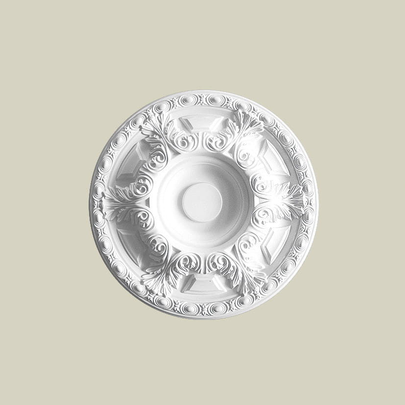 Rozeta sufitowa R11 to bogato zdobiony element sztukateryjny, który stanowi kwintesencję stylu klasycznego i barokowego. Jej misterna konstrukcja, łącząca motywy roślinne z geometryczną precyzją, sprawia, że jest to idealny wybór do reprezentacyjnych wnętrz, takich jak salony, jadalnie czy hole. Dzięki swojej dekoracyjnej formie model ten tworzy luksusową oprawę dla żyrandoli, nadając sufitowi prestiżowy wygląd.